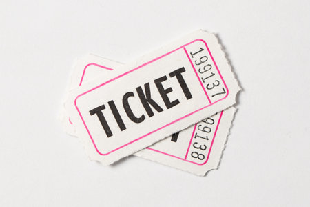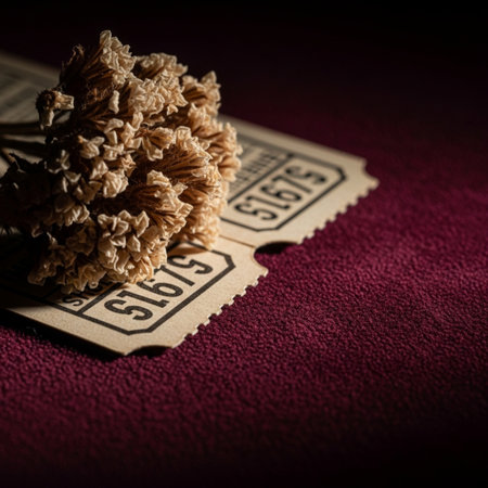 High angle, cinematic flat lay of worn concert and movie tickets symbolizing shared memories and nos