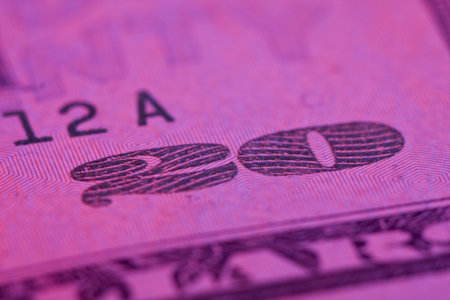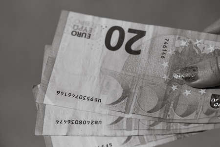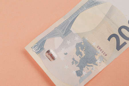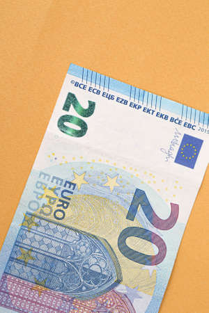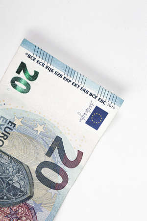 Selective focus on detail of euro banknotes. Close up macro detail of money banknotes, 20 euro isolated. World money concept, inflation and economy concept