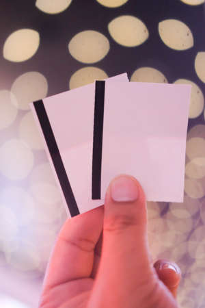 Hand holding a paper ticket on blurred background (movie cinema concept concept)