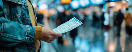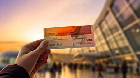 Generative AI : Close up hands woman is picking and holding passport and boarding pass Looking information board at airport terminal