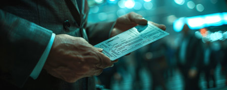 A close-up shot of a businessperson's hand holding a boarding pass and passport while waiting in line at airport security