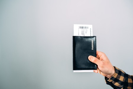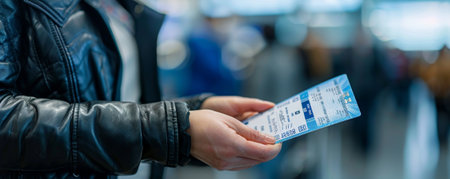 Young man's hand holding a paper ticket on blurred background (booking ticket concept)