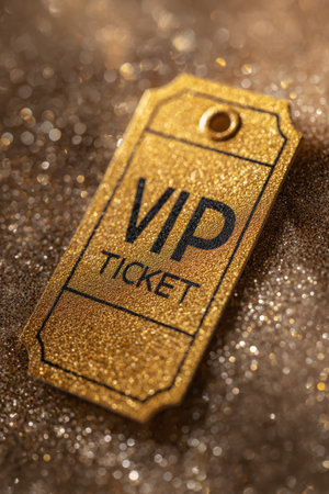 Gold VIP ticket resting on a shimmery surface capturing the essence of luxury and exclusivity for a special event