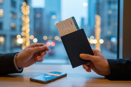 Hands holding a passport with a boarding pass and a smartphone on a table.