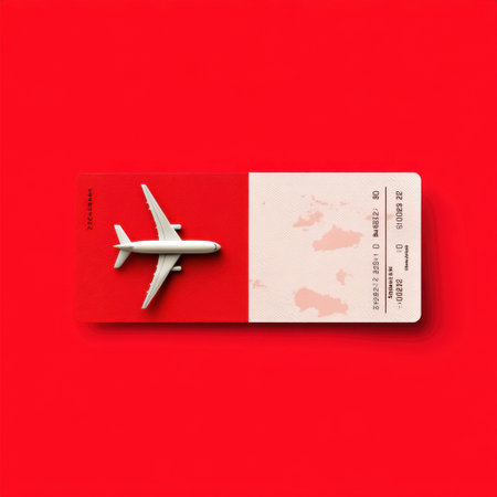This creative composition features a miniature airplane placed on a travel ticket against a vibrant red background, symbolizing adventure and travel.