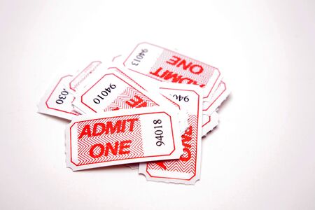 Single white vintage admission ticket on top of a red ticket isolated on white background