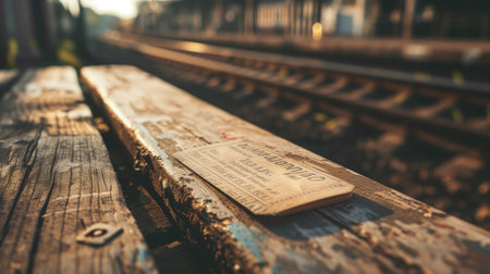 An old, weathered train ticket lies on a railway sleeper in warm sunlight with tracks the background.