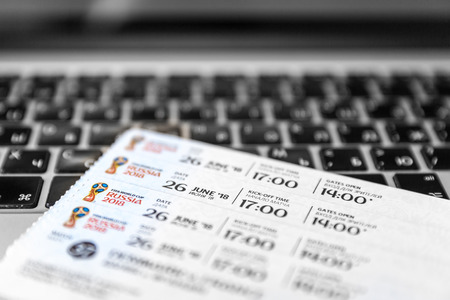 FIFA Venue Ticketing Center, Moscow, Russia - April 2018. Tickets for the 2018 FIFA World Cup in Russia in summer, Luzhniki Stadium, Denmark - France.