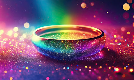Captivating rainbow light refracts through a sleek, dark glass bowl, casting vibrant abstract patterns and soft bokeh for a mesmerizing visual effect.