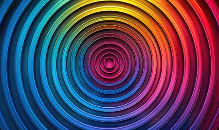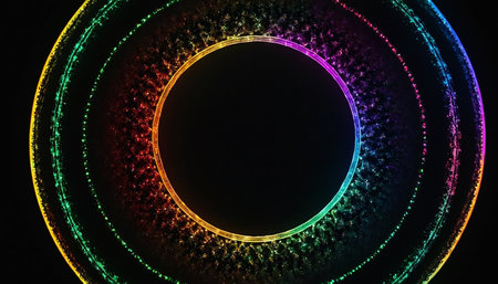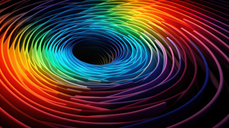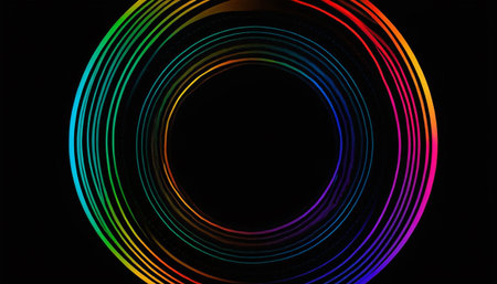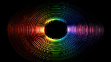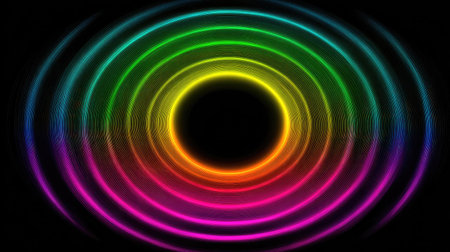 This captivating image features vibrant waves of colorful light arranged in circular patterns, set against a dark backdrop, creating a mesmerizing effect.