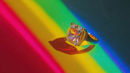 A stunning diamond ring captures attention with its sparkling brilliance against a vibrant rainbow background, showcasing beauty and elegance.