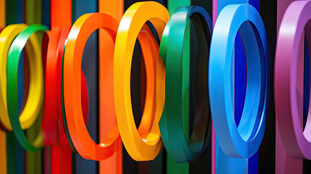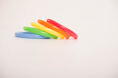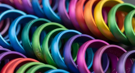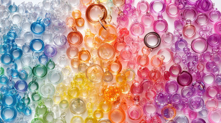 A vibrant macro photograph captures a collection of colorful rings arranged in rows. The rings display a rainbow spectrum of hues with a metallic or matte finish, creating a cheerful and abstract pattern of circles and colors.