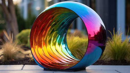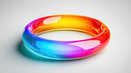 This striking abstract design features a colorful glass ring with vibrant hues and smooth curves, set against a minimalist background, ideal for modern decor.
