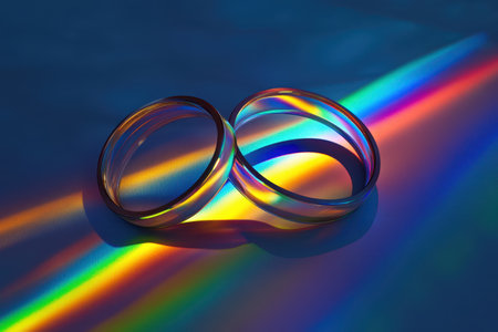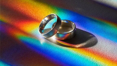 Silver wedding rings resting on textured surface, enhanced by colorful light reflections, symbolizing love and commitment in a vibrant and romantic setting, AI generated