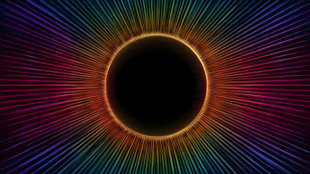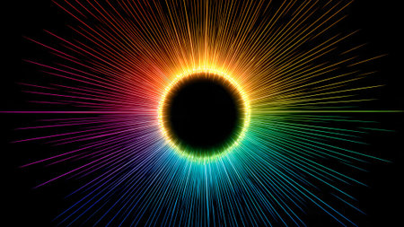 Colorful abstract background with rainbow light rays emanating from a central black circle. Modern design element.