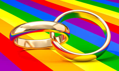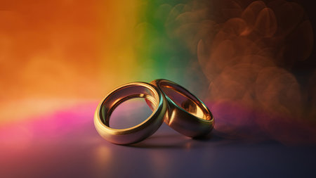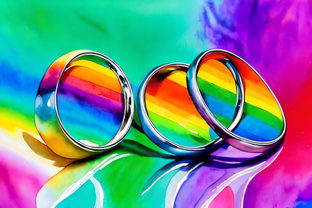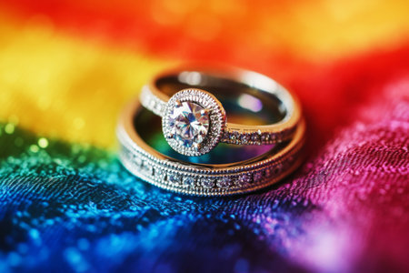 Two wedding rings resting on a rainbow flag, symbolizing love, commitment, and the unity of LGBTQ couples, representing pride and the fight for equal recognition and rights
