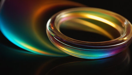 A macro of a transparent, ring-shaped set against a dark background. The acts as a prism, refracting light to create a vibrant display of rainbow colors, including teal, blue, orange, gold, and purple. The smooth, glossy surface reflects the light and the surrounding colors, creating a luminous and dynamic visual effect. The overall impression is one of beauty and abstract artistry.