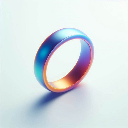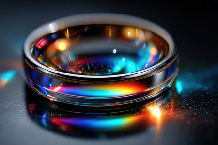 This striking metallic ring features a blend of vibrant colors and reflections, set against a sleek background. The contemporary design captures light beautifully, making it an ideal choice for showcasing modern jewelry and artistic aesthetics.