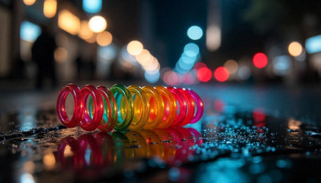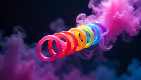 A stack of colorful sparkling rings in purple, orange, green, and pink on a vibrant bokeh background. Perfect for themes of celebration, joy, and creativity.