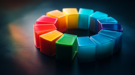 A striking arrangement of vibrant colorful shapes forming a circle, showcasing modern design principles and artistic creativity in a stylish composition.
