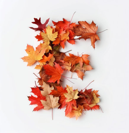A variety of autumn leaves in shades of red, yellow, and orange are artistically arranged on a white surface, showing the vibrant colors and textures of fall foliage.