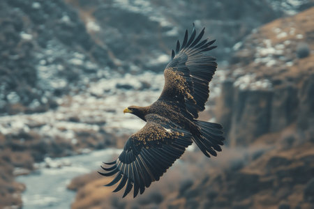 A majestic eagle is soaring through the sky above a snow-covered mountain range. Concept of freedom and power, as the eagle effortlessly glides through the air