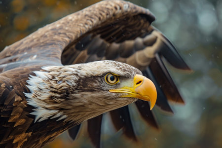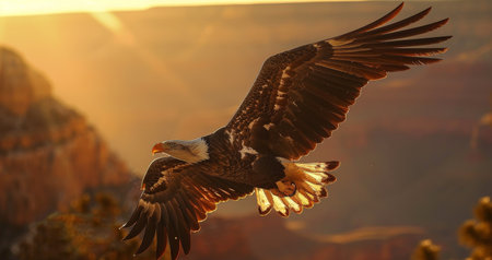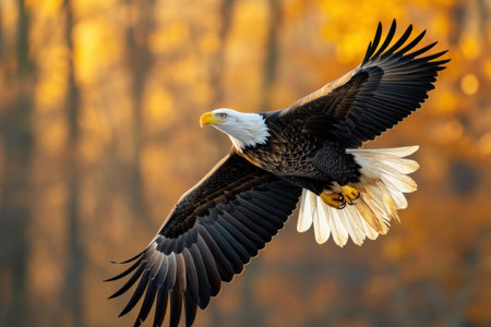 Stunning bald eagle soars with outstretched wings against a warm, golden autumn backdrop