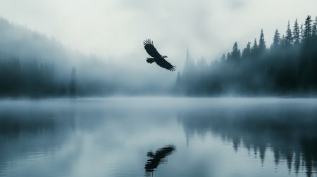 A large bird of prey soars gracefully above a mist covered lake, reflecting on the calm water. The surrounding forest is cloaked in morning fog, creating an atmospheric and serene setting.