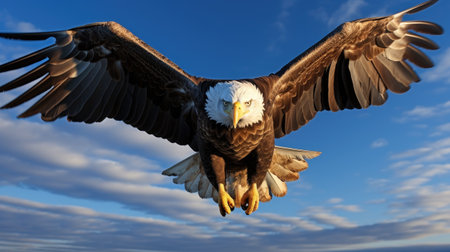 Majestic bald eagle captured in powerful flight against a gradient sky, showcasing its impressive wingspan and iconic white head