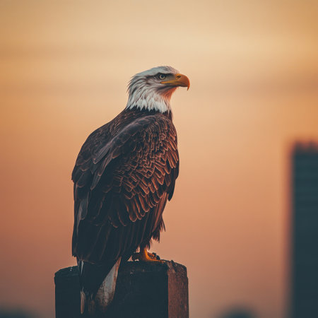 Majestic bald eagle at sunset with impressive plumage and intense gaze.