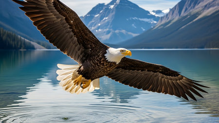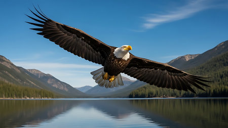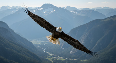A majestic bald eagle flies over a mountain backdrop, showcasing its impressive wingspan in a stunning scene