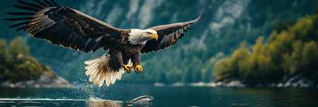 serene mountain landscape An eagle in flight catching fish from a lake,Bald eagle flying swoop hand draw and paint color on white background. Bald eagle in flight on isolated background