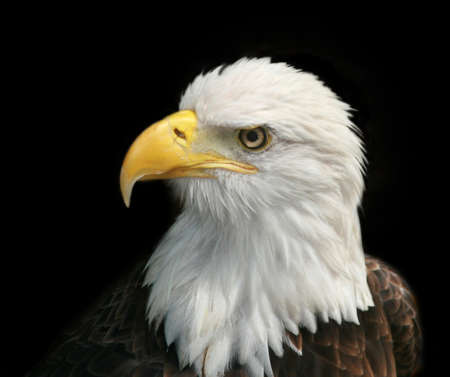 Beautiful close up portrait of an American bald Eagle (Haliaeetus leucocephalus) isolated on a black background