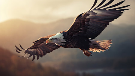 Bald eagle soaring at sunset with golden light and autumn background. Majestic wildlife and freedom concept