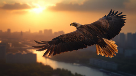 An eagle glides gracefully through the sky against a backdrop of a vibrant sunset illuminating the city skyline. The contrast highlights both nature and urban life