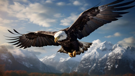 A majestic bald eagle in flight over a stunning snowy mountain range. A powerful image of nature's beauty.