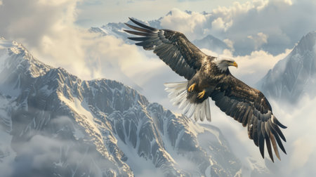 A majestic eagle is soaring through the sky above a snow-covered mountain range. Concept of freedom and power, as the eagle effortlessly glides through the air