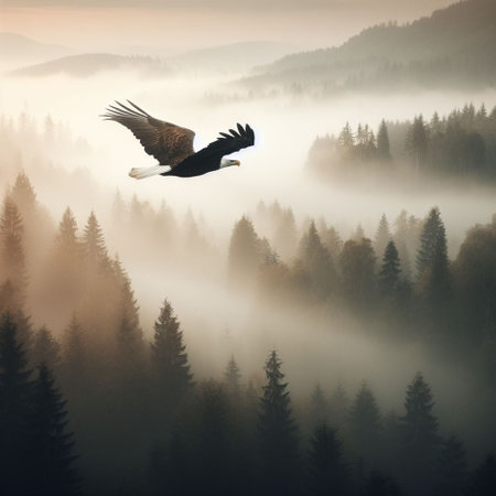 An eagle glides gracefully over a tranquil lake at dawn, with low hanging mist enveloping the water. Dense trees create a peaceful backdrop that enhances the quiet beauty of the moment.