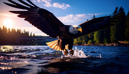 eagle's majestic descent from the sky, talons extended, aiming to snatch a fish from the water's surface with incredible precision. Generative AI