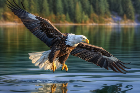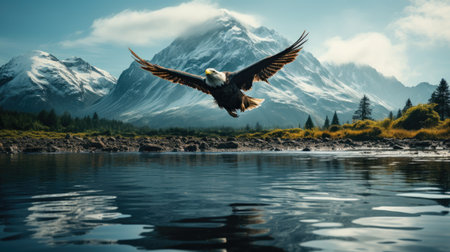 A majestic bald eagle flying above the tranquil water. AI-generated.