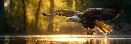 Bald eagle diving toward river surface to catch salmon, pine forest shoreline, dawn light.