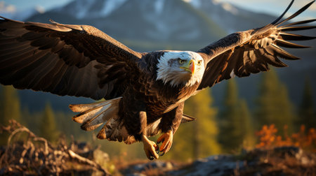 A majestic bald eagle flies over a mountain backdrop, showcasing its impressive wingspan in a stunning scene