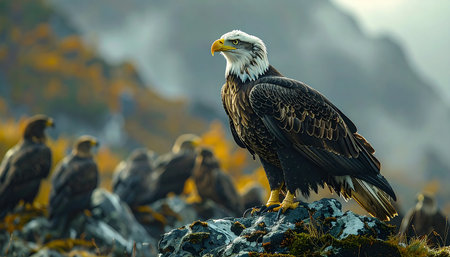 A bald eagle is perched on a rock, with a blurred background of other eagles and autumn trees.