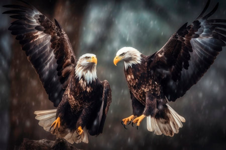 Two mighty bald eagles Haliaeetus leucocephalus engaged in an intense aerial clash battling for dominance high above a misty mountainous landscape