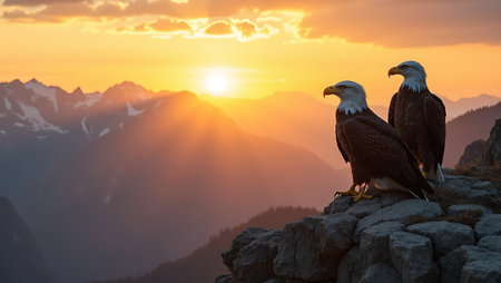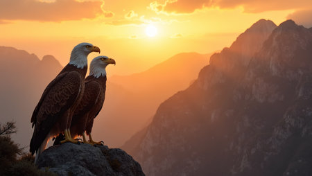 A stunning image of a pair of eagles perched on rocks, overlooking a serene mountain landscape at sunset, showcasing their majestic beauty and grace.