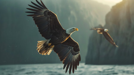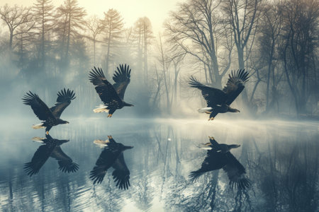 Several bald eagles soar through the sky over a scenic lake, showcasing their impressive wingspans and graceful flight, A flock of majestic eagles hunting fish over a misty lake, AI Generated