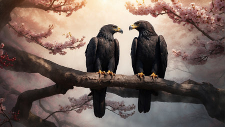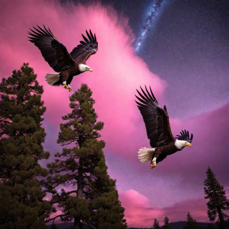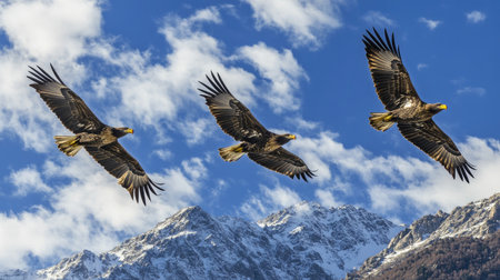Noble eagles soaring high above snow-capped mountain peaks, symbols of freedom and strength.