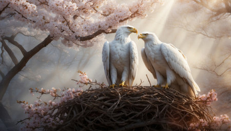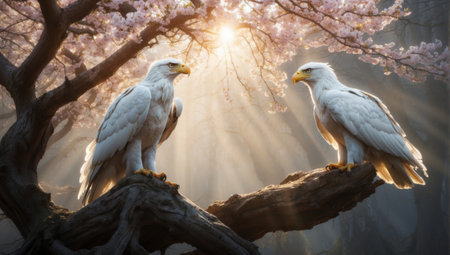 Two magnificent eagles soar majestically through a vibrant green jungle, their powerful wings spread wide as sunlight pierces the mist, creating a stunning spectacle of nature.