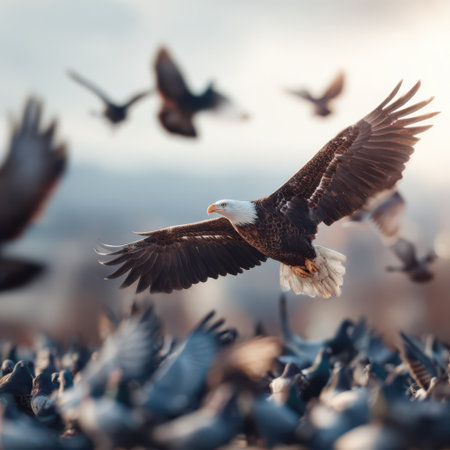 A powerful eagle glides gracefully above a bustling group of pigeons, showcasing nature's stunning contrasts at sunset.