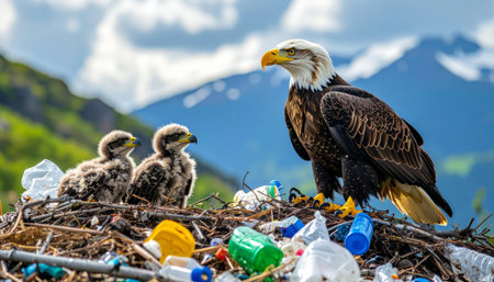 Eagle and chicks in nest surrounded by plastic pollution in natural habitat, wildlife 128070